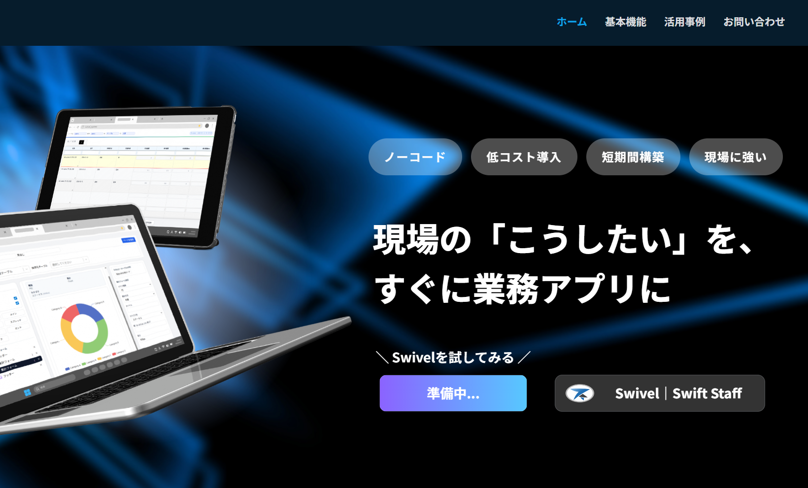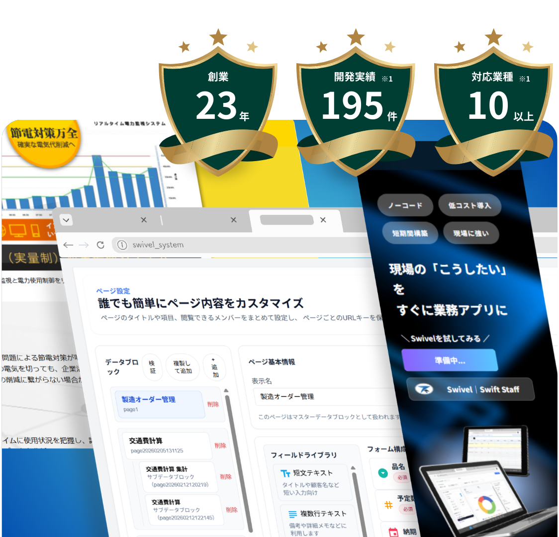 自社で開発したビジネスプラットフォーム「Swivel(スイベル)」を活用することで、 専門的なプログラミング知識がなくても直感的にシステム画面が作成できる環境を実現しました。 設計から構築、運用までを一貫してサポートし、導入後も安心してご利用いただけます。 また、「Swivel」をベースに お客様の業務に合わせた柔軟なカスタマイズ開発にも対応しています。 自社プラットフォームを活用することで、 短期間・低コスト・高品質なシステム提供が可能です。